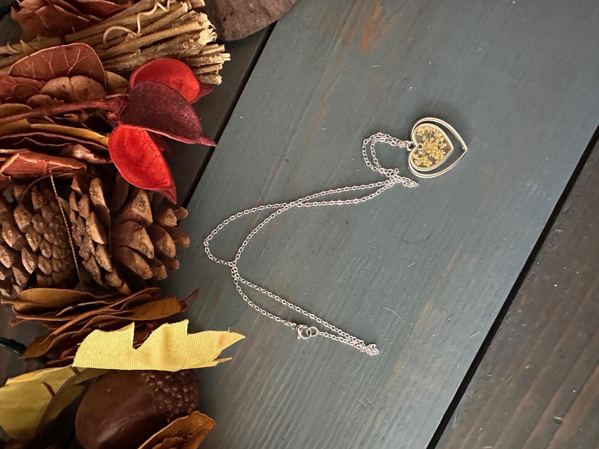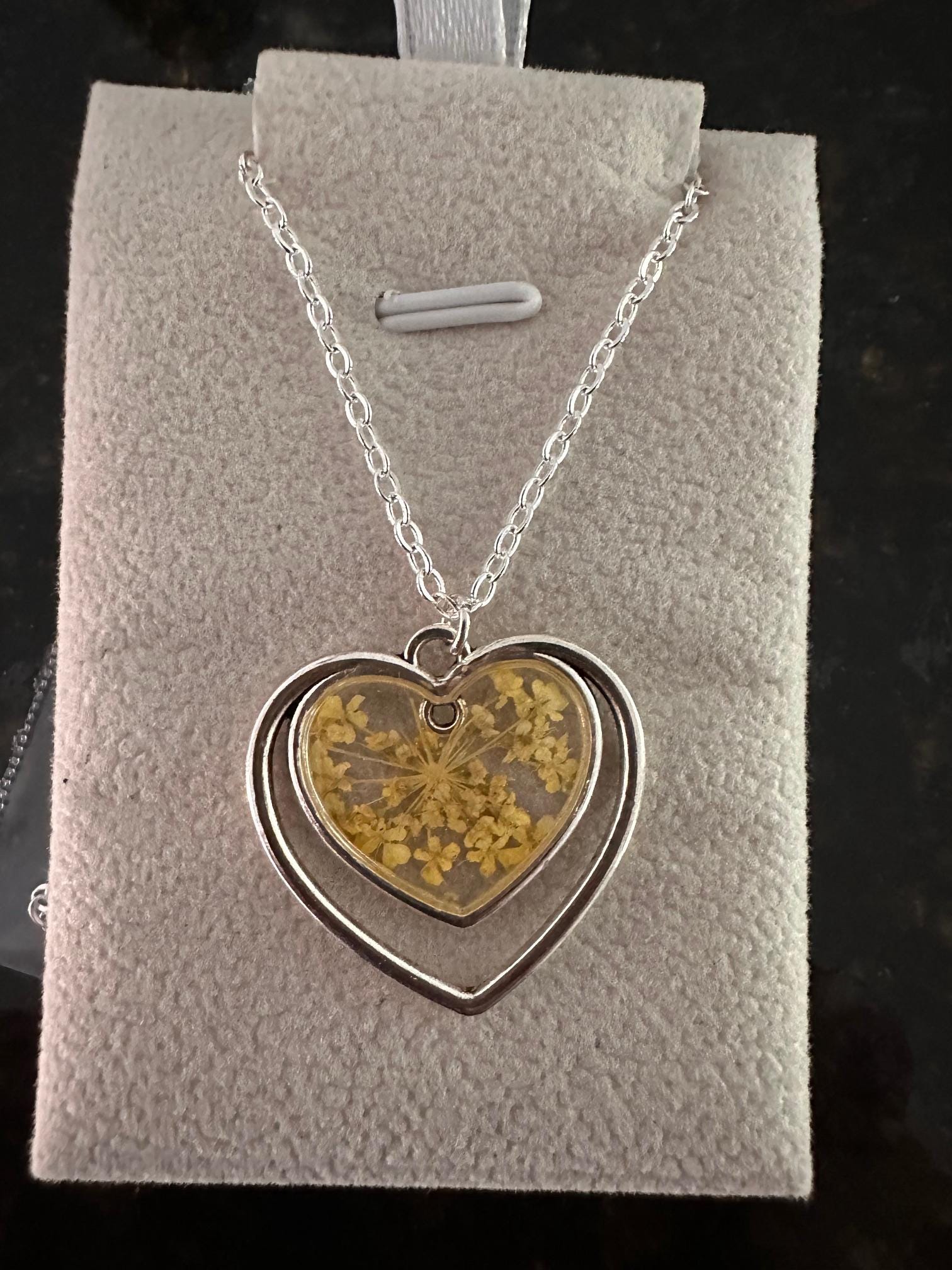 Delicate, timeless, and naturally beautiful — this handmade necklace features a real Queen Anne’s Lace flower preserved in crystal-clear resin. The tiny blossoms are arranged inside a heart-shaped bezel, then framed with a second open heart outline for a soft, romantic touch.