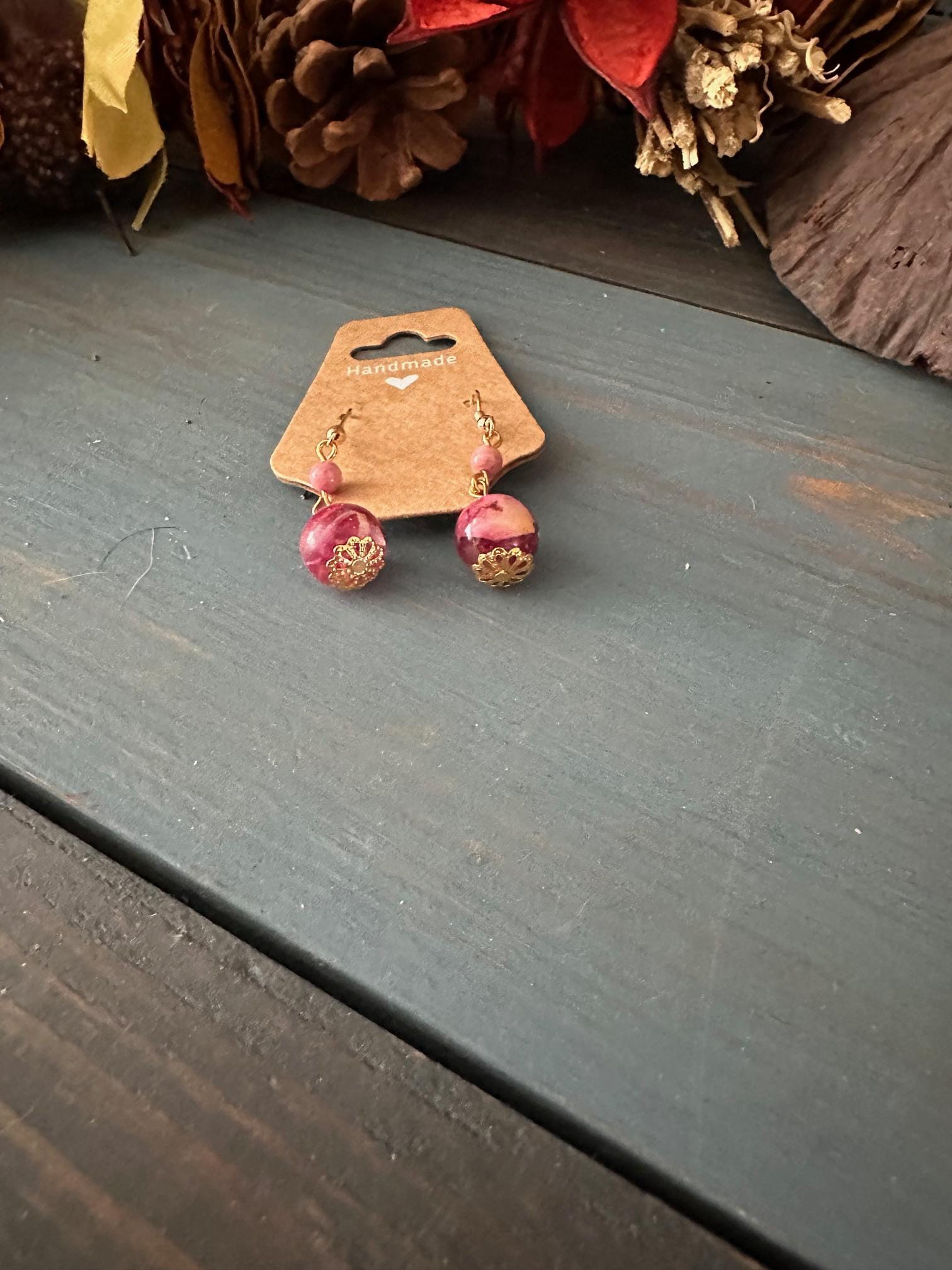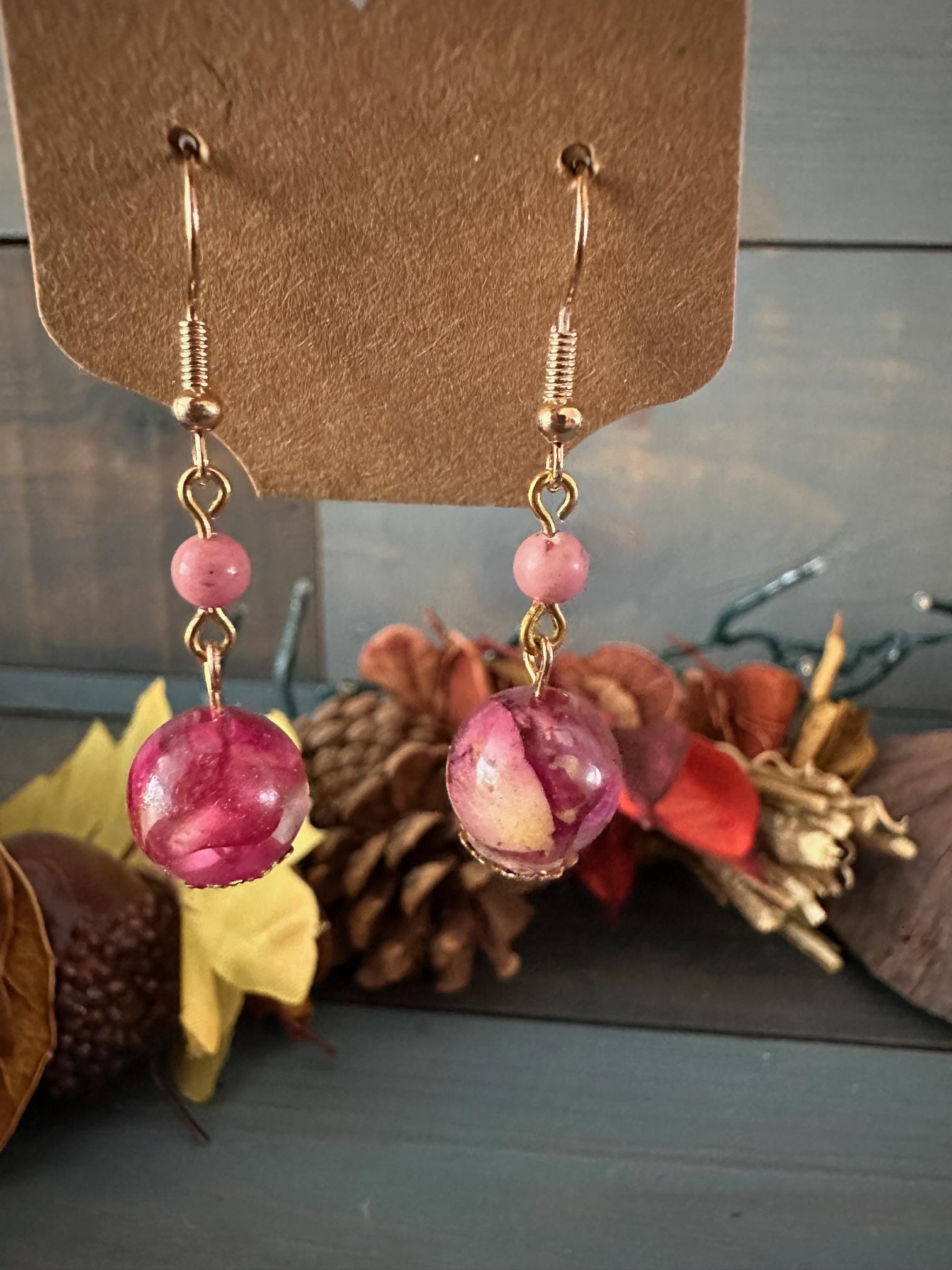 Pressed Rose Petal Dangle Earrings – Real Flower Resin Jewelry with Rhodonite Beads