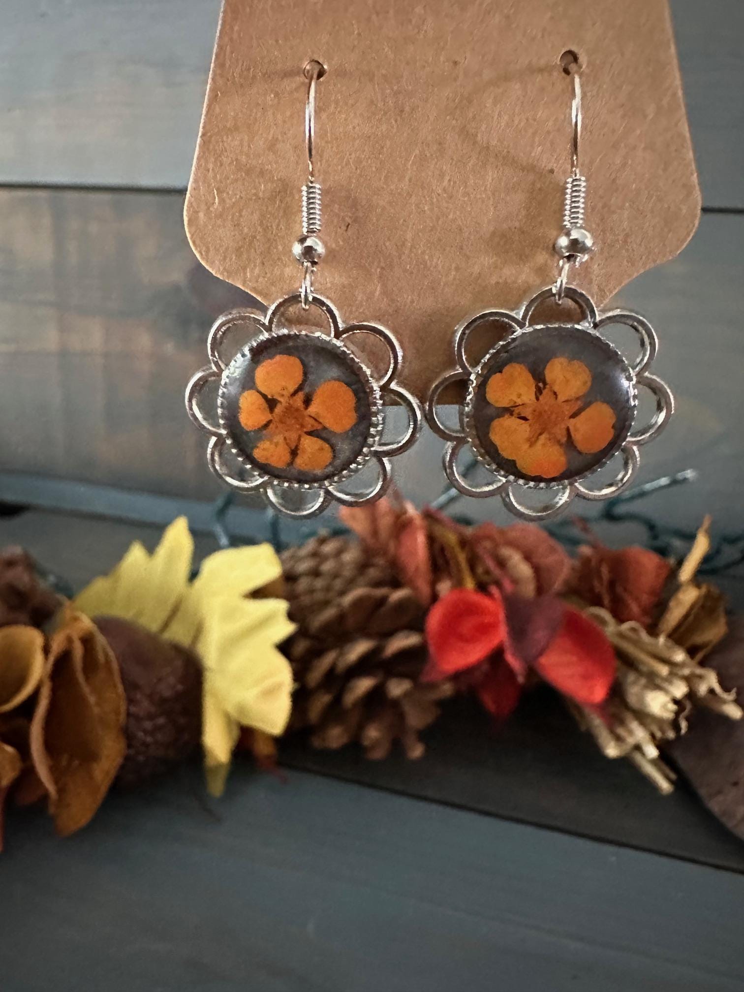 Each pair is created using silver-plated bezel settings and matching hooks, giving the earrings a clean, polished look that complements the vibrant florals.