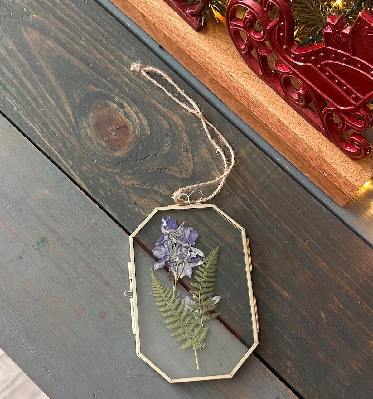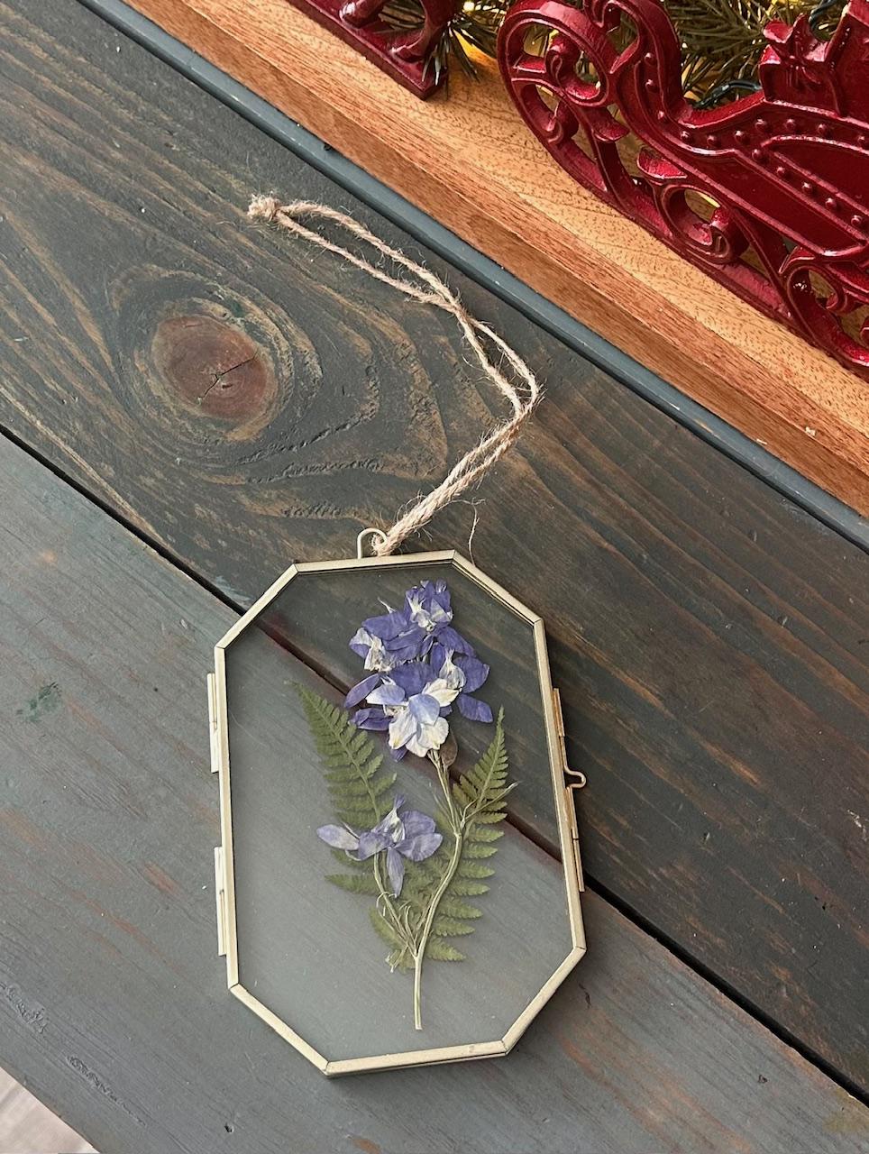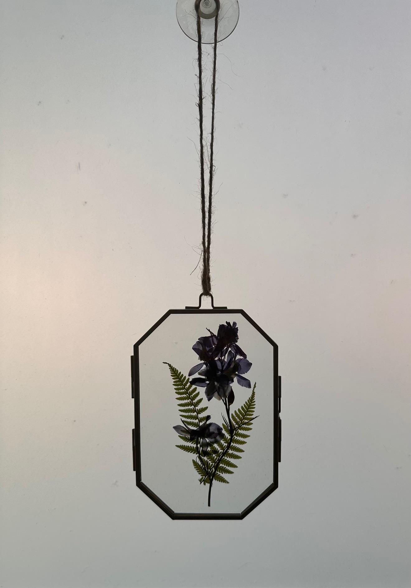 Bring natural beauty indoors with this handmade pressed botanical frame. Featuring delicate pressed purple larkspur paired with graceful green fern fronds, this piece is set inside a clear glass, brass-tone octagonal frame for a timeless, minimalist look. Finished with a rustic twine hanger, it’s perfect for adding a soft botanical touch to any space.