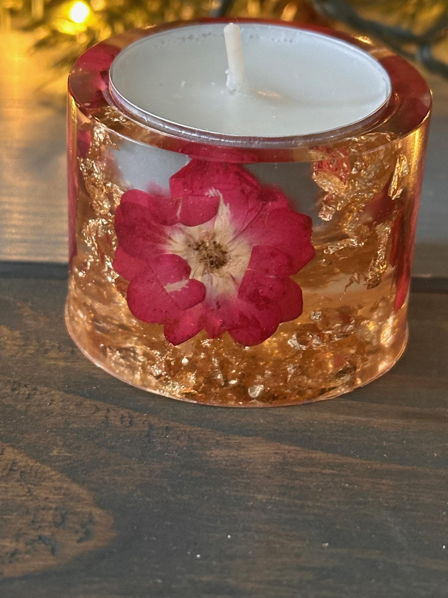 Add a warm, romantic glow to your space with this one-of-a-kind handmade tea light holder, featuring a real pressed red rose flower preserved in crystal-clear resin with a subtle gold foil flakes touch. Each piece is carefully handcrafted, making it a unique accent for cozy evenings, seasonal décor, or heartfelt gifting.
