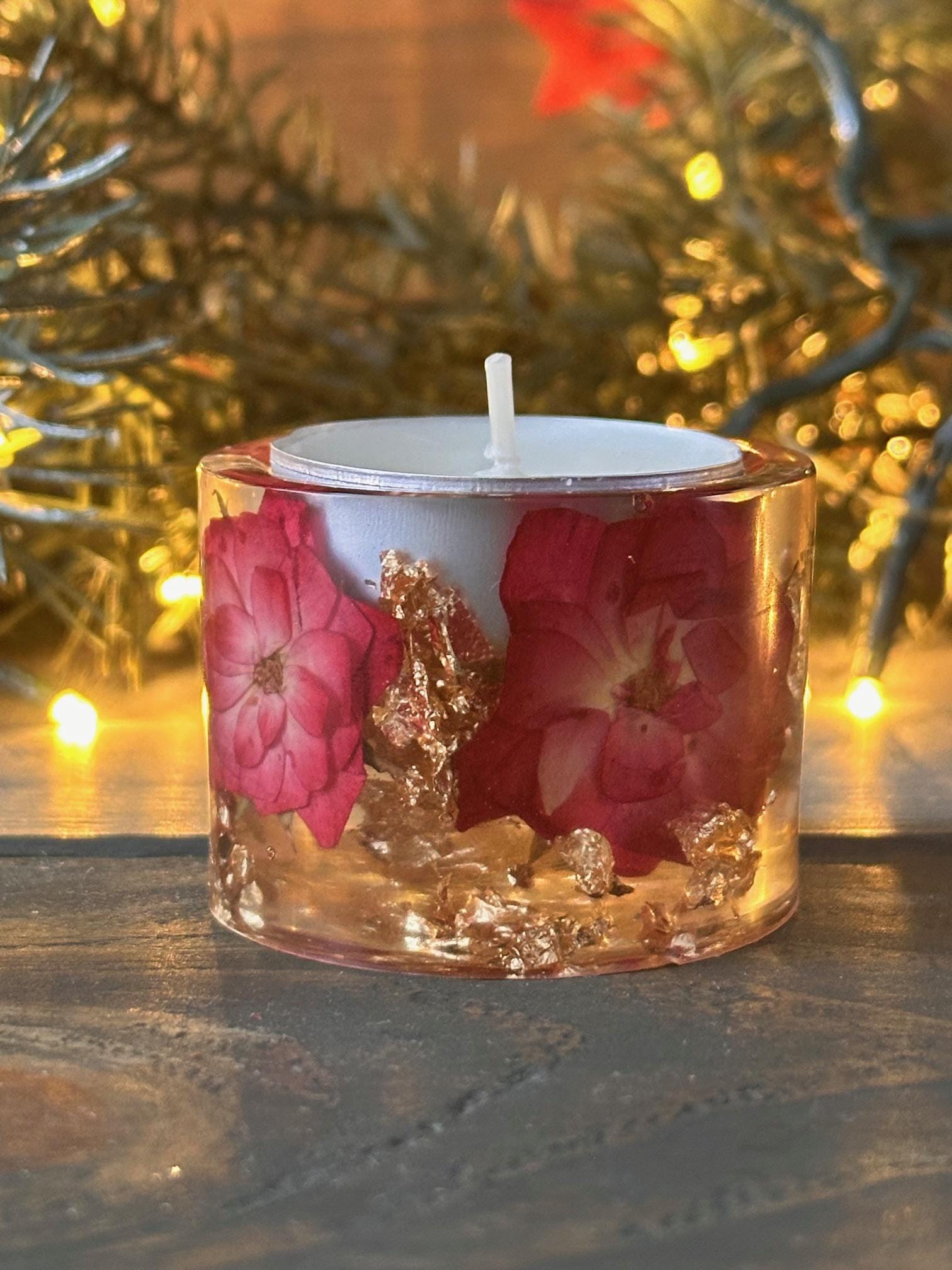 Add a warm, romantic glow to your space with this one-of-a-kind handmade tea light holder, featuring a real pressed red/pink rose flower preserved in crystal-clear resin with a subtle gold foil touch. Each piece is carefully handcrafted, making it a unique accent for cozy evenings, seasonal décor, or heartfelt gifting.